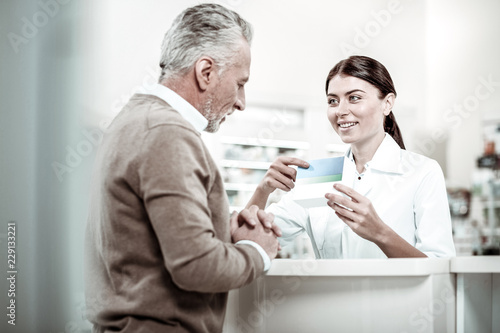 Cheerful pharmacist. Pleasant cheerful dark-haired pharmacist talking to her grey-haired client asking some questions