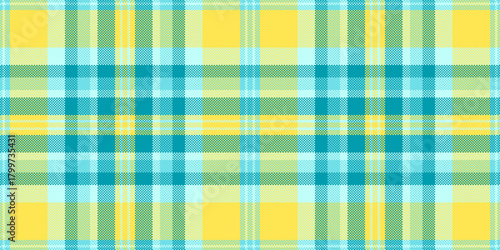 Cheerful plaid pattern featuring bright yellows, greens, and blues. Versatile textile design suitable for backgrounds, apparel, or adding a touch of colorful warmth to creative projects.