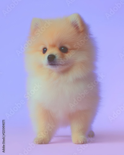 Cheerful pomeranian dog portrait pastel purple background fluffy appearance pet soft environment happy concept