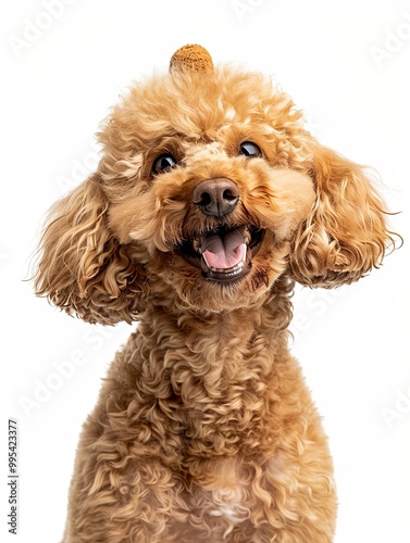 Cheerful Poodle with a smiley emoticon, balancing a small squeaky toy on its head, facing the camera against a pure white background.