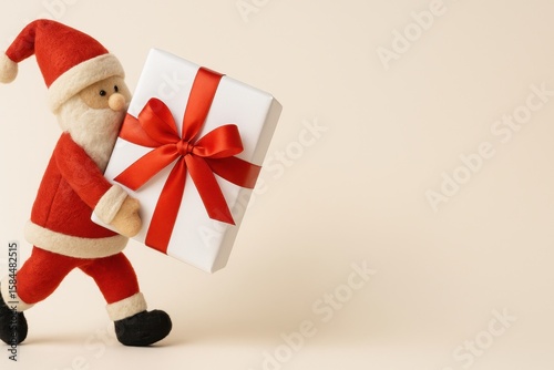 Cheerful Santa Claus Figure Carrying a Gift Box with Red Ribbon for Holiday Decoration and Festive Celebrations in Soft Tones on Light Background
