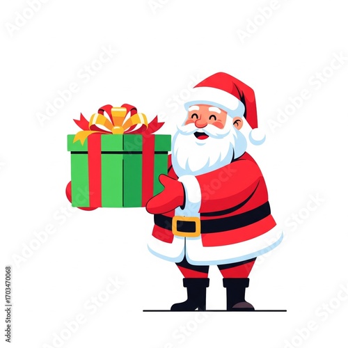 Cheerful Santa Claus Holding Green Christmas Present with Red Bow on White Background