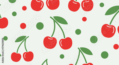 Cheerful seamless pattern design featuring vibrant red cherries and green polka dots perfect for