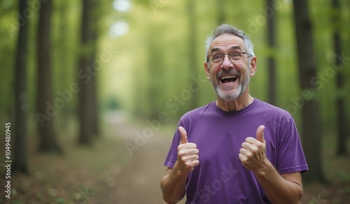 Cheerful Senior Man Enthusiastically Giving Thumbs Up in Forest
