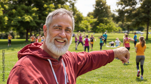 Cheerful senior man with white beard leading outdoor fitness group in park, wearing red hoodie while demonstrating exercise moves on sunny summer day