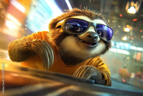 Cheerful sloth wearing sunglasses is speeding with determination and glee