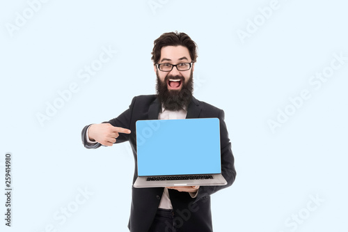 cheerful smiling bearded businessman pointing on blank laptop computer screen
