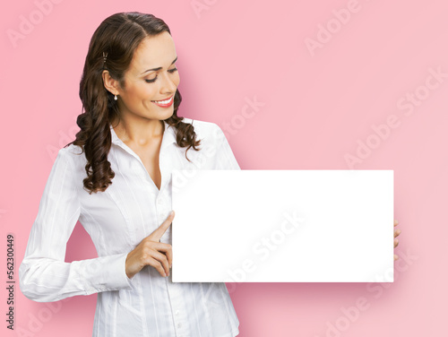 Cheerful smiling brunette business woman in white confident clothing showing empty mock up signboard. Success and advertising concept. Copy space place, isolated on rose pink background.