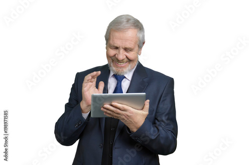 Cheerful smiling businessman with tablet device. Portrait of happy old senior man in business suit using portable computer device. White Isolated background.