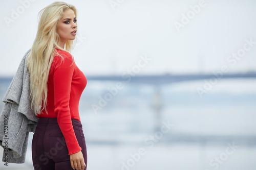 Cheerful smiling young woman on street. Beautiful fresh looking cute blonde girl outdoors at autumn. Street style concept