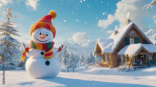 Cheerful Snowman in Front of a Cozy Cottage in Winter Wonderland