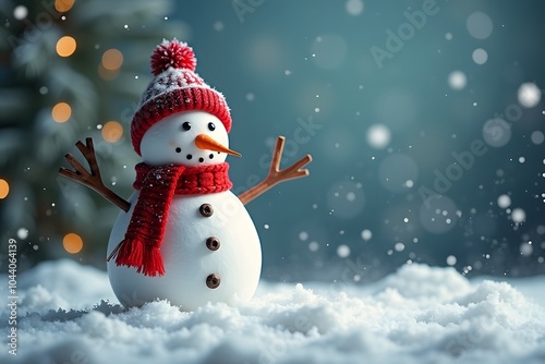 Cheerful snowman wearing red winter accessories against bokeh lights background