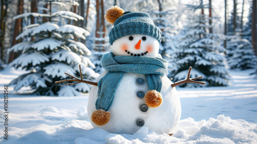 cheerful snowman with blue scarf and hat stands in snowy forest, surrounded by evergreen trees. Its friendly expression brings joy to winter landscape