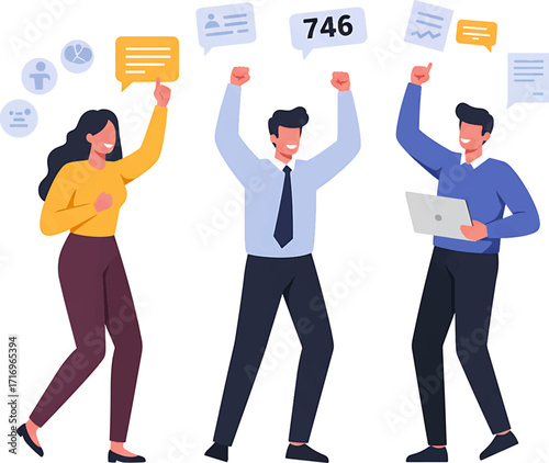 Cheerful Team Celebrating Success with Speech Bubbles and Laptop.