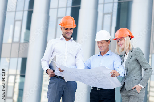 Cheerful three builders are planning new project