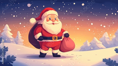 Cheerful traditional Santa Claus standing in a snowy landscape with a bag of gifts during sunset creating a festive holiday atmosphere