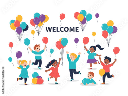 Cheerful Welcome Celebration: Group of kids holding balloons and celebrating a warm, inviting welcome message, evoking a sense of excitement and happiness.