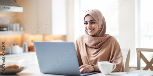 Cheerful woman in light hijab using laptop in a well-lit kitchen, freelance work concept. Generative AI