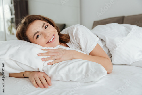 Cheerful woman lies in bed at home indoors.