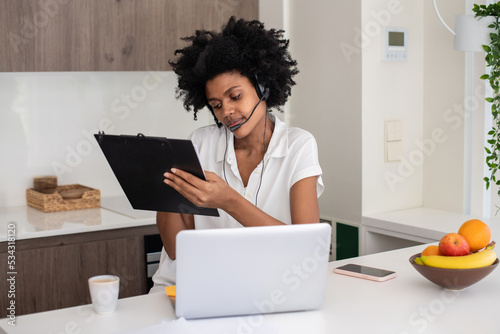 Cheerful woman with headset working from home. Young African American employee sitting at desk, holding clipboard, having online video call. Home office, communication, occupation concept