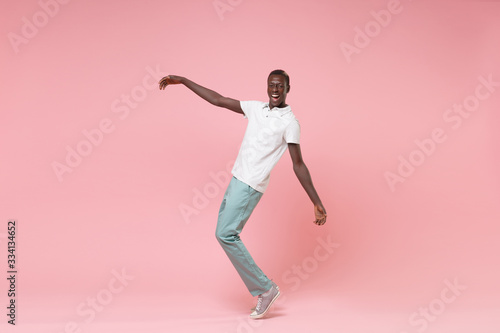 Cheerful young african american man guy in white polo shirt, turquoise trousers posing isolated on pastel pink wall background. People lifestyle concept. Mock up copy space. Standing on toes, dancing.