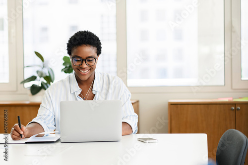 Cheerful young african-american businesswoman, ceo, manager working on laptop, doing online market research, working on project, creating plan or checking financial statement, taking notes