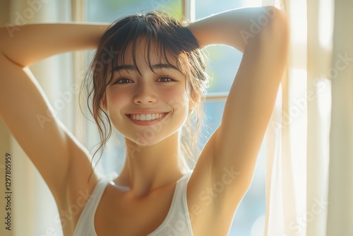 Cheerful Young Asian Woman Posing with a Smile in Natural Light Near a Window, Radiating Joy and Warmth in a Comfortable Indoor Setting