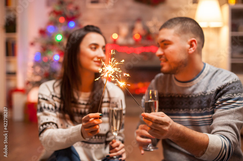 Cheerful young couple holding hand fireworks celebrating christmas.