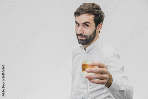 Cheerful young entrepreneur drinks champagne. During this celebrating Valentine's day. Dressed in white shirt.