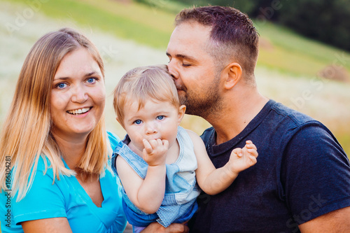 Cheerful young family with children stands on the field