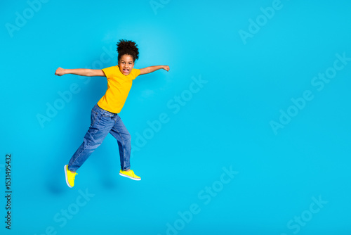 Cheerful young girl jumping with enthusiasm on a vibrant blue background, wearing casual yellow shirt and jeans, expressing energy