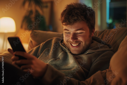 Cheerful Young Man Enjoying Smartphone on Cozy Sofa