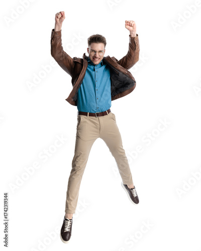 cheerful young man holding arms above head, jumping and celebrating