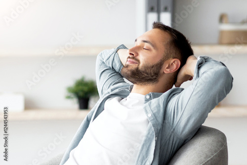 Cheerful young man resting in comfy armchair, chilling with closed eyes, holding hands behind his head at home. Positive Caucasian guy spending relaxing weekend morning in living room