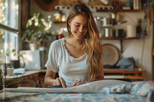 Cheerful young seamstress ironing a garment with focus in a bright workshop