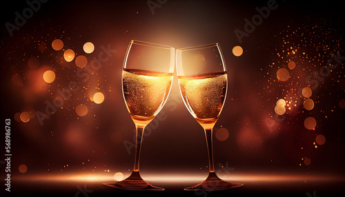Cheers, champagne glasses, blurry golden festive background. generative AI