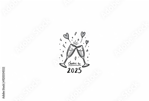 Cheers to 2025 Happy New Year Celebration Hand Drawn Doodle Two Champagne Glasses with Heart Balloons Festive Holiday Toast Minimalist Design Black and White Illustration Greeting Card Banner Social