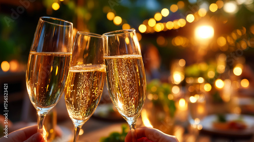 Cheers to celebration! Three glasses of sparkling champagne clink together under warm, festive string lights at a magical evening gathering.