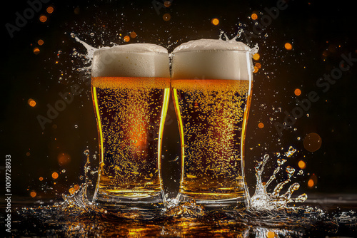 Cheers Two beer glasses clinking with foamy splashes on dark background. Stock photo for your creative content.