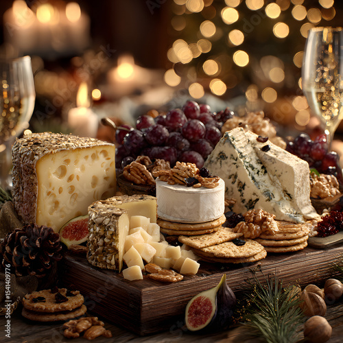 cheese board with various cheeses, grapes, nuts, figs, and crackers, festive greenery around.