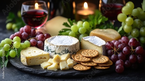 Cheese, Grapes, Crackers, and Wine Arrangement on Slate
