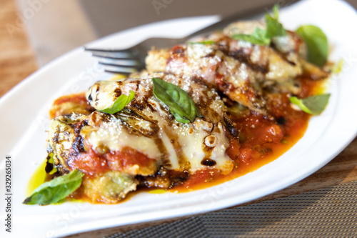 Cheese gratinated baked eggplant with Spanish Tomato Sauce