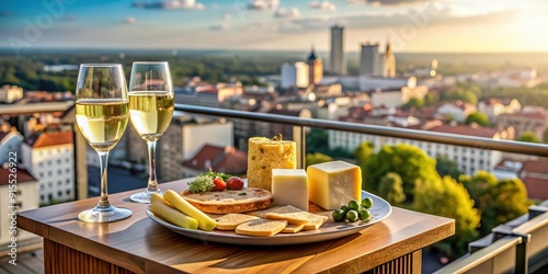 Cheese platter and champagne served on a balcony overlooking the city, cheese, platter, champagne, balcony, city view