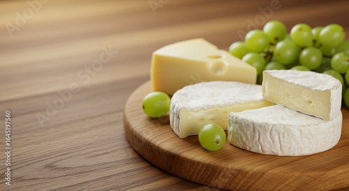Cheese types including brie and swiss with green grapes on a wooden board. Delicious food for a snack. Copy space.