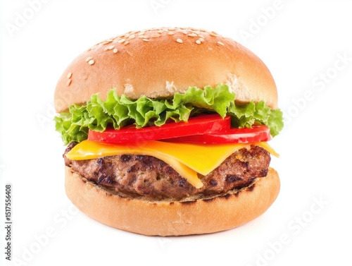 Cheeseburger with lettuce, tomato, and sesame bun on white background