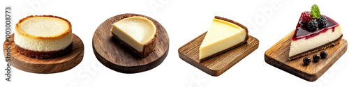 Cheesecake on a wooden tray, isolated on white background. Mix Collection PNG.