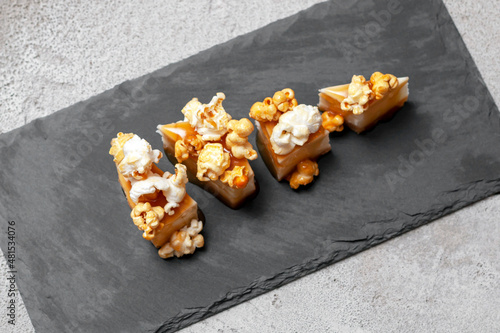 cheesecake with salted caramel and popcorn on a black slate board in the middle of the photo on a gray background, top view.