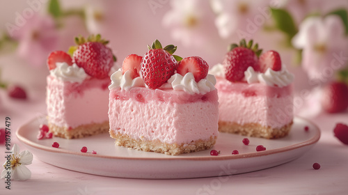 cheesecake with strawberry on pink background and flower