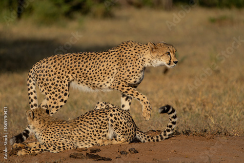 Cheetah (Acinonyx jubatus). A cheetah family of a mother with 5 sub adult cubs was hanging around in Mashatu Game Reserve in the Tuli Block in Botswana