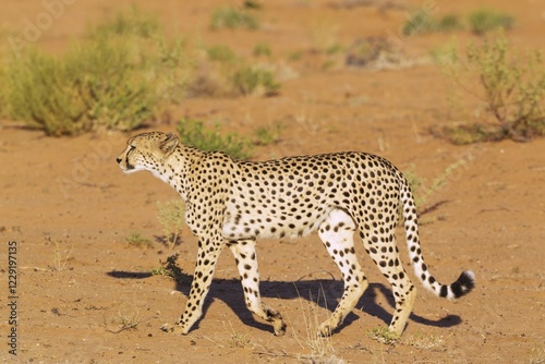 Cheetah (Acinonyx jubatus), walking male, Kalahari Desert, Kgalagadi Transfrontier Park, South Africa, Africa